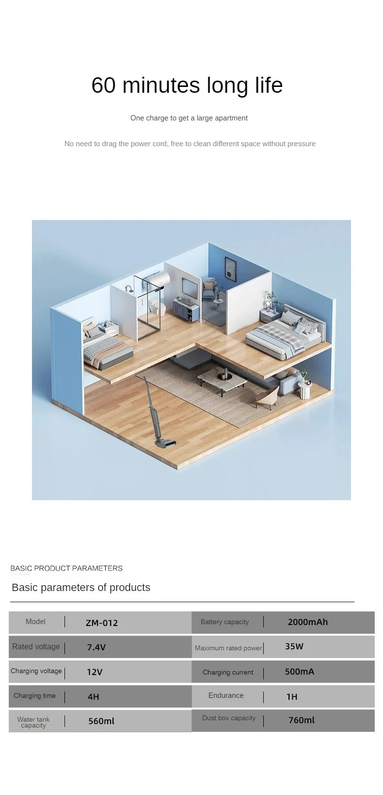 | Product Name: Intelligent Floor Washing Machine Product size unfolded 37 * 32.8 * 119, folded 37 * 32.8 * 69 Battery specification: Lithium battery 2000MAH Voltage/power 7.4V/35W Adapter output 12/0.5V The weight of a floor scrubber without a cleaning base is 2.5KG Charging time is about 4H Working hours are around 60-70 minutes Water tank capacity 560ml Dust box capacity 760ML Color box size (mm) 68 * 32.8 * 41.5CM, 57 * 37 * 24CM Basic packaging material configuration: 1 host, 1 cleaning board component, 1 cleaning base, 1 instruction manual, 1 cleaning brush, 1 charger, and 1 drum (already installed in the host) |